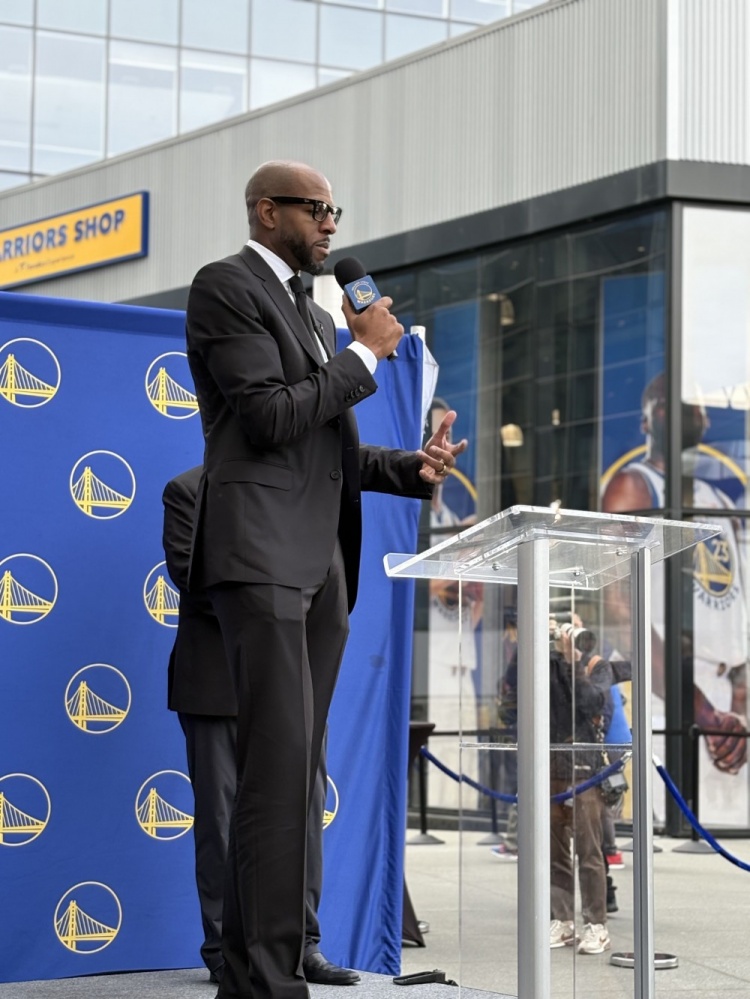 我還想歡迎所有曾經效力于勇士的優秀球員、NBA球員、2015年冠軍隊的球員,以及安德烈的所有朋友。今天將是非常美好的一天,真的非常美好。