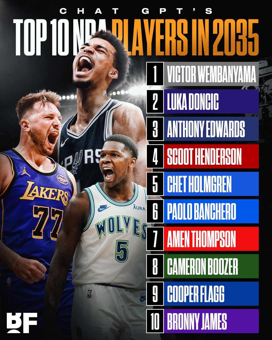 2025-03-12 23:49:48ChatGpt預測十年后前十球員:文班第一 東契奇第二 布朗尼第10