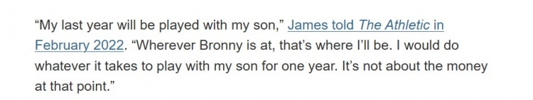 2022年2月,詹姆斯在接受The Athletic采訪時第一次談到父子同臺的愿望:“我在生涯最后一年會和我兒子一起打球,無論布朗尼在哪里,我都會去那個地方。我愿意做任何事情來實現與我的兒子一起打球一年。屆時錢也就不重要了。”
