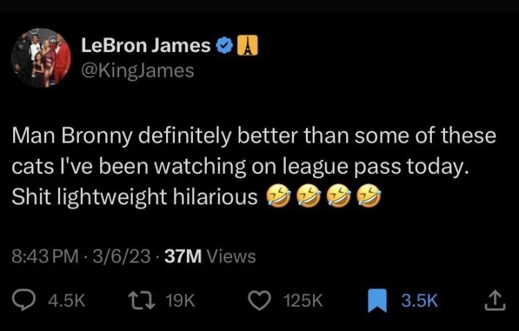 在2023年3月6日,詹姆斯發推寫道:“天啊,布朗尼絕對強于今天我在聯盟通(注:NBA官方比賽直播服務)上看到的一些阿貓阿狗。這場面真的有點好笑????????????????”