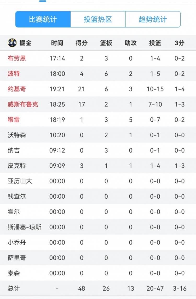 2025-03-13 16:12:08都是臥底?掘金全隊除約基奇和威少外合計22投3中 穆雷7中0