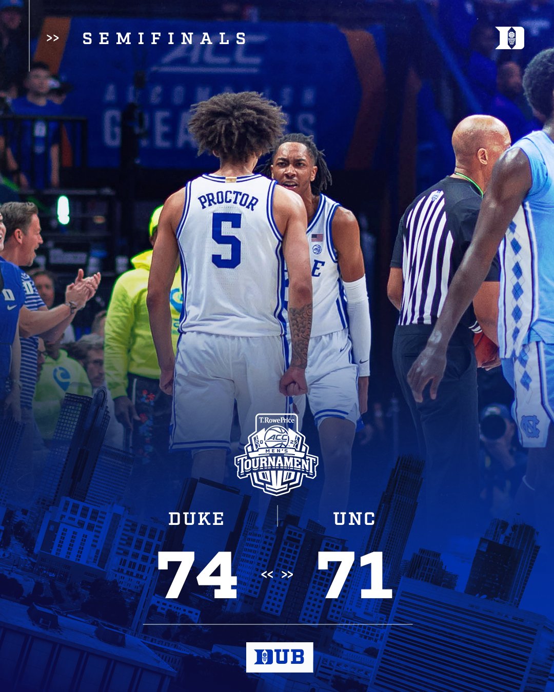 03月15日訊 ACC錦標賽半決賽,杜克74-71險勝北卡,挺進決賽。