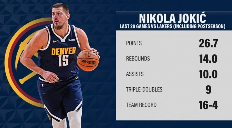 2025-03-15 21:14:40約基奇過去20場對陣湖人:場均26.7分14板10助&9次三雙 16勝4負
