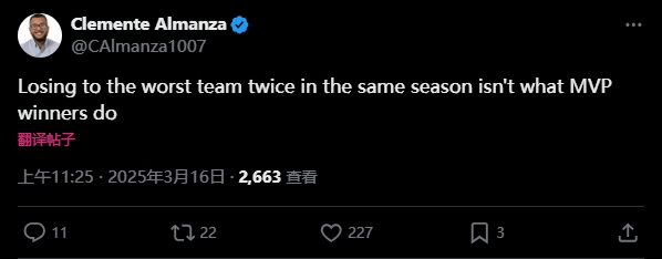 2025-03-16 22:45:40雷記揶揄:一個賽季兩次輸給聯盟最差的球隊 可不是MVP該有的表現