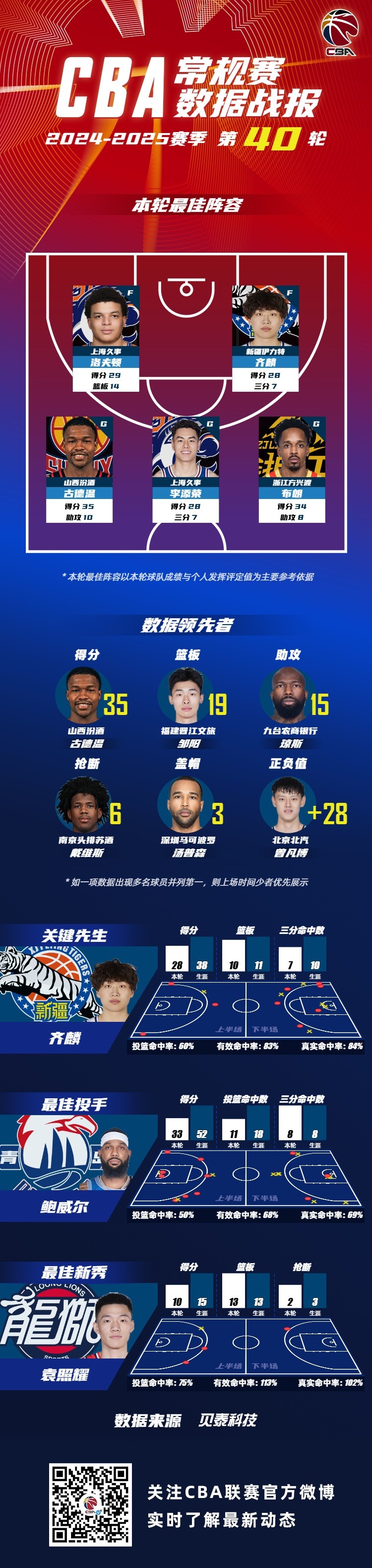 2024-2025賽季CBA聯賽常規賽第40輪結束較量,來自上海久事大鯊魚的洛夫頓和李添榮,新疆廣匯籃球俱樂部的齊麟,山西汾酒職業籃球俱樂部的古德溫和浙江廣廈籃球俱樂部的布朗入選CBA聯賽常規賽第40輪最佳陣容!