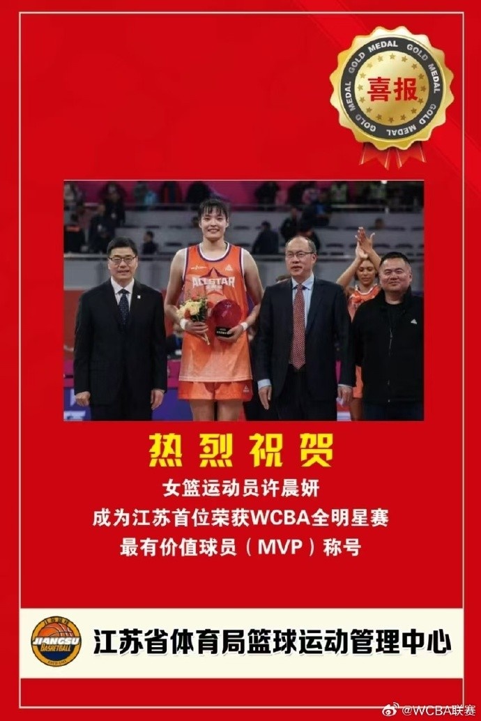 2025-02-25 00:26:42江蘇省體育局籃球中心發(fā)來賀電 祝許晨妍成江蘇首位女籃全明星MVP