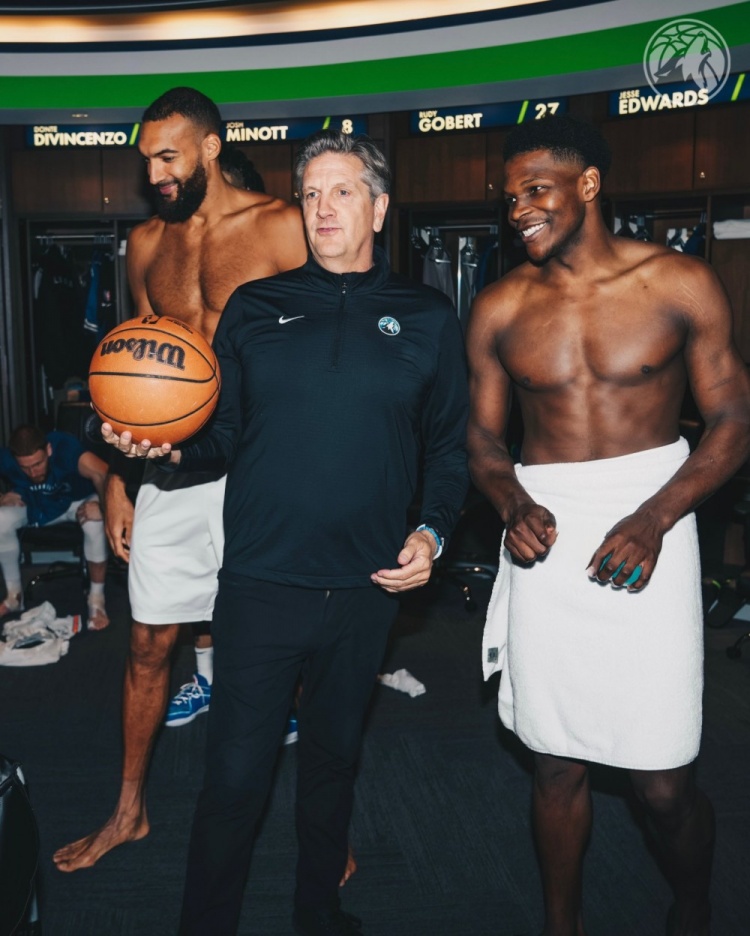 2025-03-17 10:33:22森林狼更衣室祝賀芬奇200勝:拿到比賽用球 華子戈貝爾裹浴巾合影