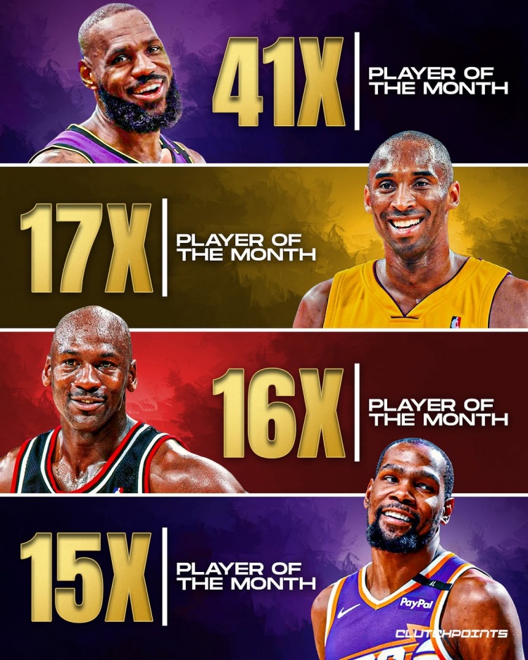 2025-03-17 10:38:24詹姆斯41次月最佳歷史斷檔第一 科比17次第二 喬丹16第三KD15第四