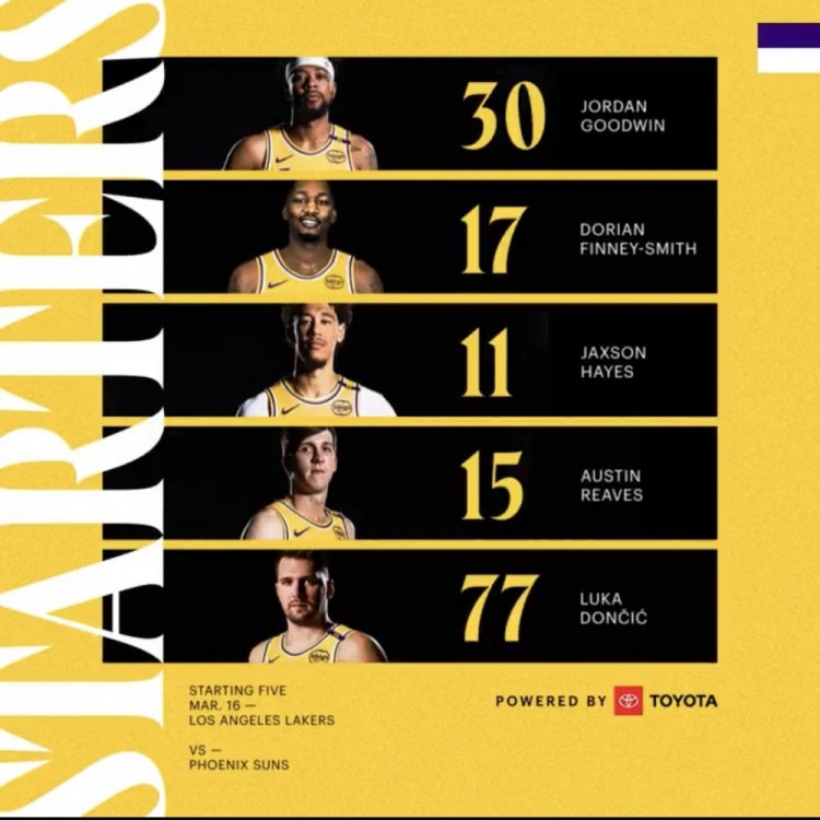 2025-03-17 10:46:17湖人首發:東契奇 里夫斯 古德溫 芬尼-史密斯 海斯
