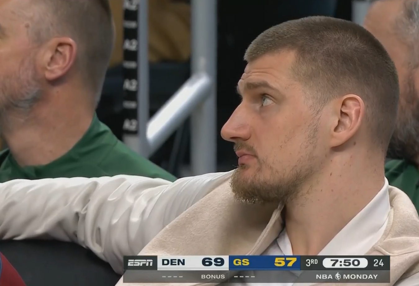 2025-03-18 18:18:57舒服~殘陣掘金領先勇士兩位數 場下的約基奇一臉淡定~