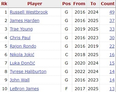 2025-03-18 18:20:25威少過去10個賽季50次半場助攻上雙 同期最多 哈登37次第二