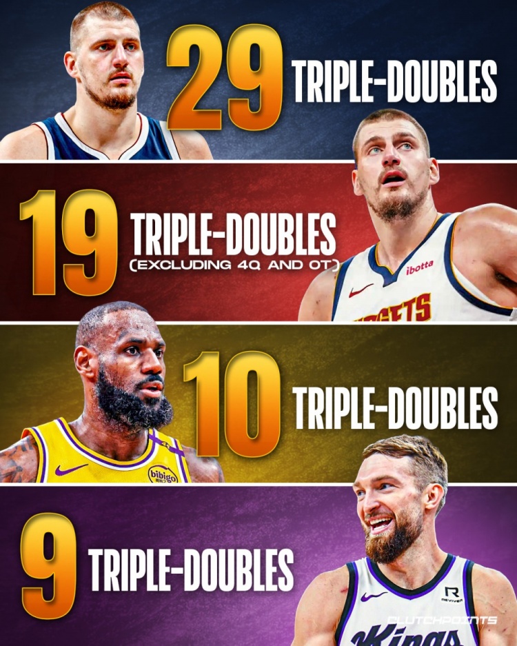 2025-03-18 18:28:10本賽季三雙榜:約基奇29次第一&只算前3節(jié)19次 詹姆斯10次第二