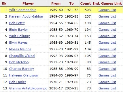 2025-03-23 19:43:03字母哥第222場比賽30+10板 現役斷檔領先 濃眉第2 詹姆斯第3