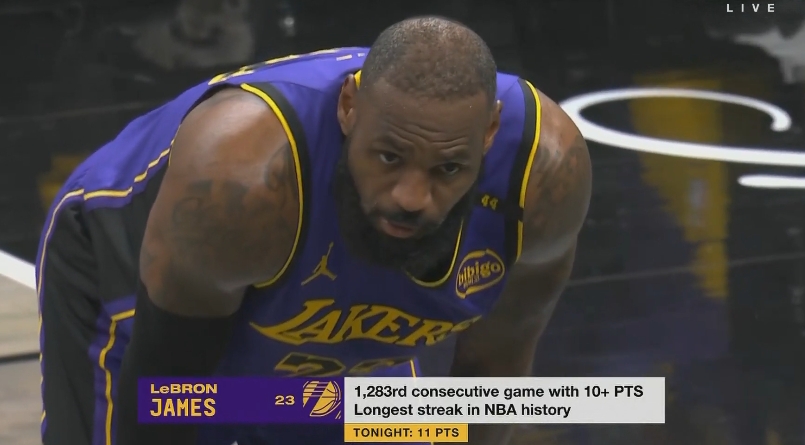 2025-03-27 19:16:05雖遲但到!詹姆斯第四節開局連得8分連續1283場比賽得分上雙!