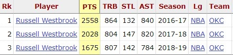 2025-03-29 19:55:25威少目前總得分、助攻和搶斷都進了歷史前20 僅他和詹姆斯做到