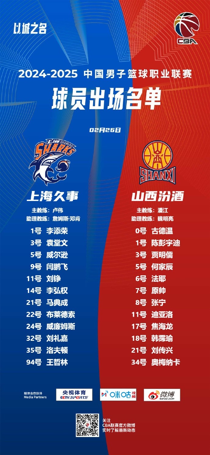 2025-02-26 16:19:47上海VS山西大名單:多諾萬-威廉姆斯首秀 王哲林、張寧在列