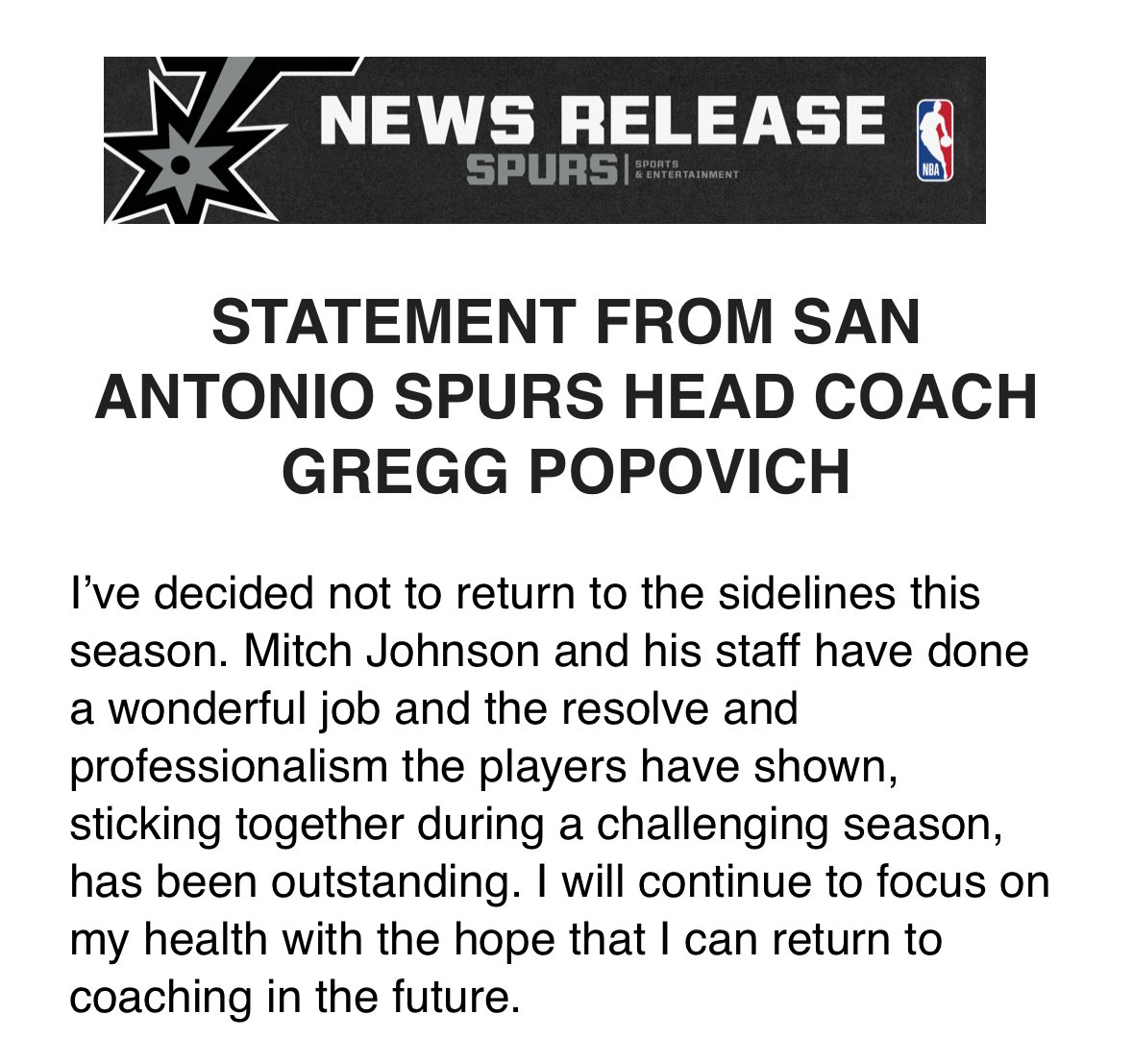 2025-02-28 08:15:15Haynes:波波維奇中風以來首次發表全隊講話 表示本賽季不會復出