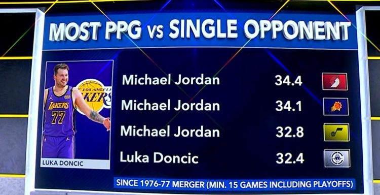 2025-03-01 16:20:22NBA合并以來球員VS球隊場均得分榜:喬丹霸榜前3 東契奇對快船第4