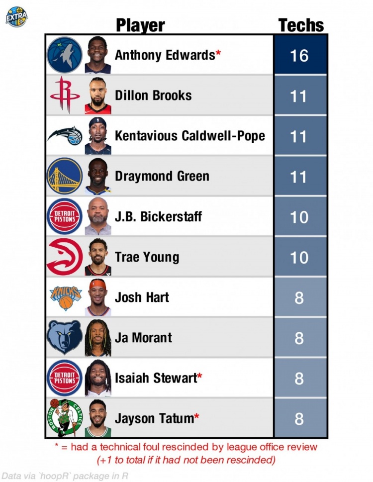 2025-03-01 16:29:57華子16次遭停賽!本賽季技犯榜:狄龍&追夢(mèng)11次第二 活塞主帥10次