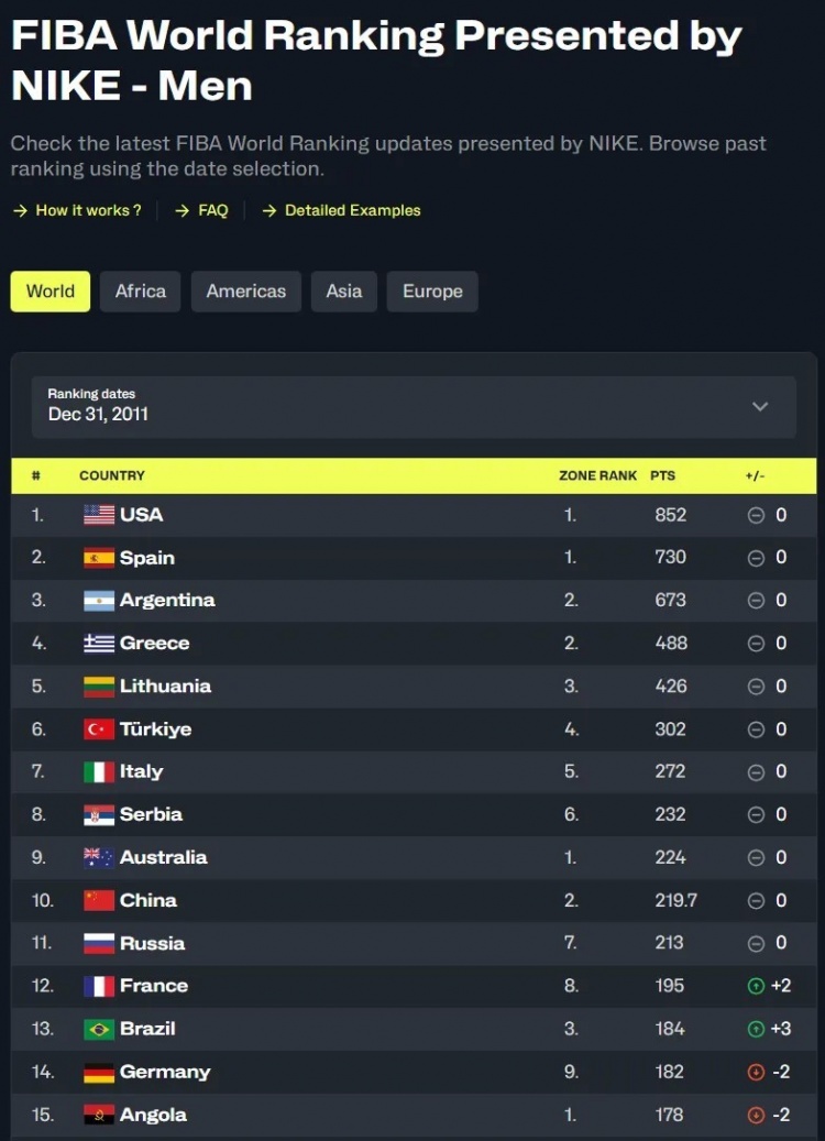 相對而言,國際籃聯FIBA對于世界排名的計算就不太被關注了,不僅在于它的算法更為繁瑣和復雜,更在于一直以來都頗有幾分神秘色彩。