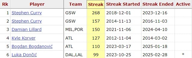 2025-03-03 17:40:29東契奇連續100場比賽有三分入賬 是歷史上第5位做到的球員