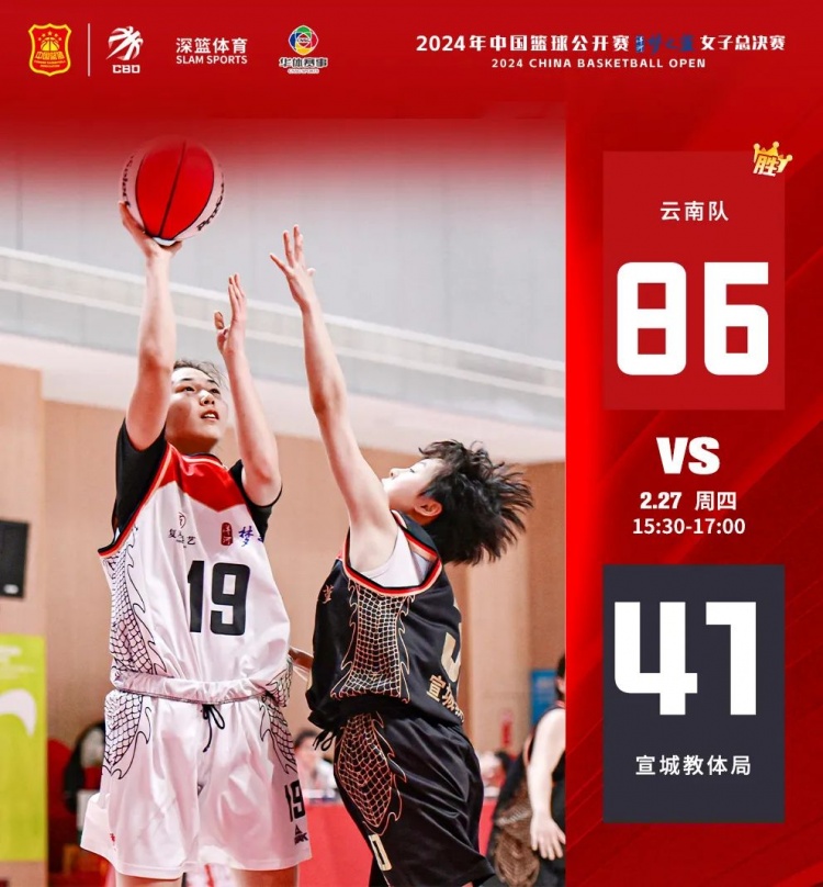兩連勝的云南隊,本輪對陣實力相對較弱的宣城教體局。上半場,云南隊打出一波11-0的得分潮。落后的宣城教體局在技術上稍顯稚嫩,半場結束,云南隊43-14宣城教體局。下半場,宣城教體局命中率有所提高,但面對云南隊還是存在很大差距,最終,云南隊86-41戰勝宣城教體局。