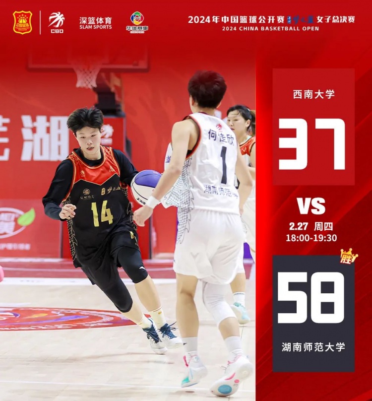 上半場,在開局短暫僵持后,湖南師范大學開始進攻,15號劉嘉芳后場籃板拼搶積極,6號沈思榆、1號何佳欣兩分命中,湖南師范大學22-8領先西南大學。次節湖南師范大學繼續高歌猛進,多次搶斷快攻打成。半場結束,湖南師范大學36-20領先。下半場,西南大學手感欠佳,兩節只得到17分,最終湖南師范大學58-37戰勝西南大學。