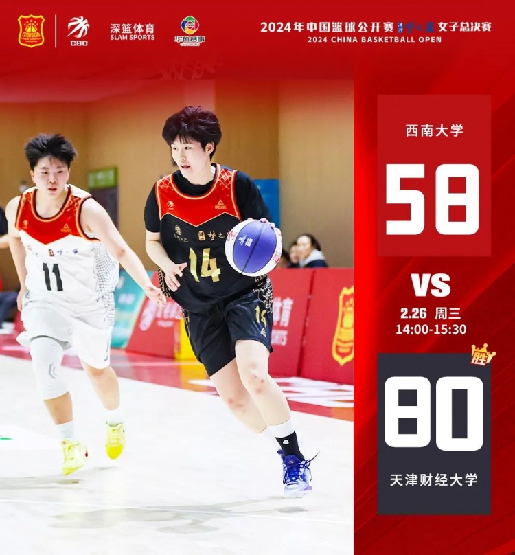 上半場首節,兩隊打得相對膠著,比分緊咬。第二節,西南大學手感欠佳,單節只得到9分。天津財經大學則保持著不錯的進攻勢頭,單節拿到25分。半場結束,天津財經大學37-24領先西南大學。下半場,西南大學7號應茵、12號莫琇雅前后場籃板拼搶積極,但無奈前期存在一定差距,最終西南大學58-80不敵天津財經大學。
