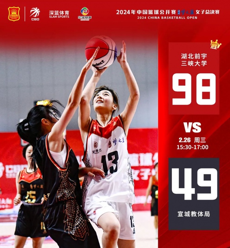 上半場,湖北前宇三峽大學11號劉欣怡、2號張歡分別命中兩分,幫助球隊取得領先。宣城教體局6號張紫涵扳回兩分后,湖北前宇三峽大學在技術和經驗上的優勢逐漸顯露,打出一波8-0的得分潮。半場結束,湖北前宇三峽大學53-21領先宣城教體局。易邊再戰,宣城教體局雖然頑強拼搏,但年輕小將在實力上和對手還是存在著差距,將分差越拉越大。最終,湖北前宇三峽大學98-49戰勝宣城教體局。