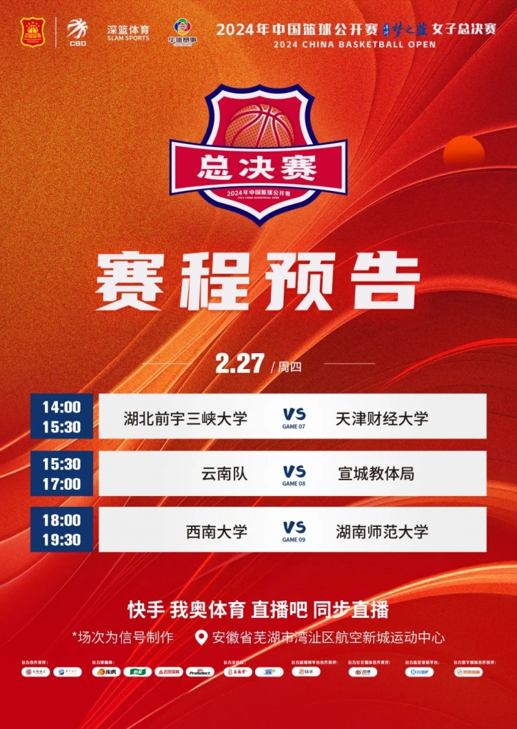 2月26日,2024年中國籃球公開賽洋河夢之藍女子總決賽繼續在安徽省蕪湖市灣沚區航空新城運動中心進行。在第二輪結束的三場比賽中,天津財經大學、湖北前宇三峽大學收獲首場勝利,云南隊力克湖南師范大學取得兩連勝。