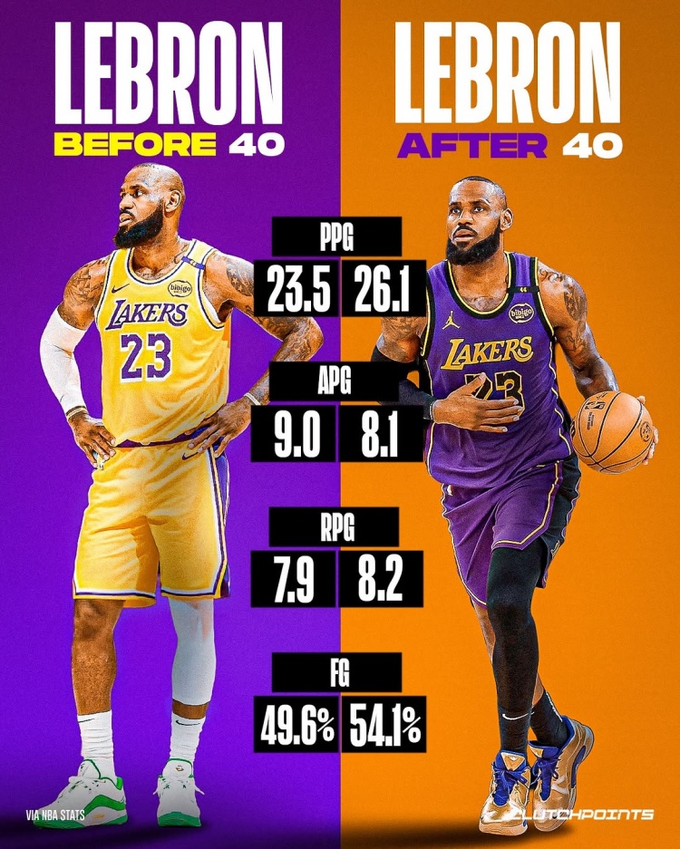 2025-03-04 22:05:18繼續逆!本季老詹40前場均23.5分7.9板9助 40后26.1分8.2板8.1助