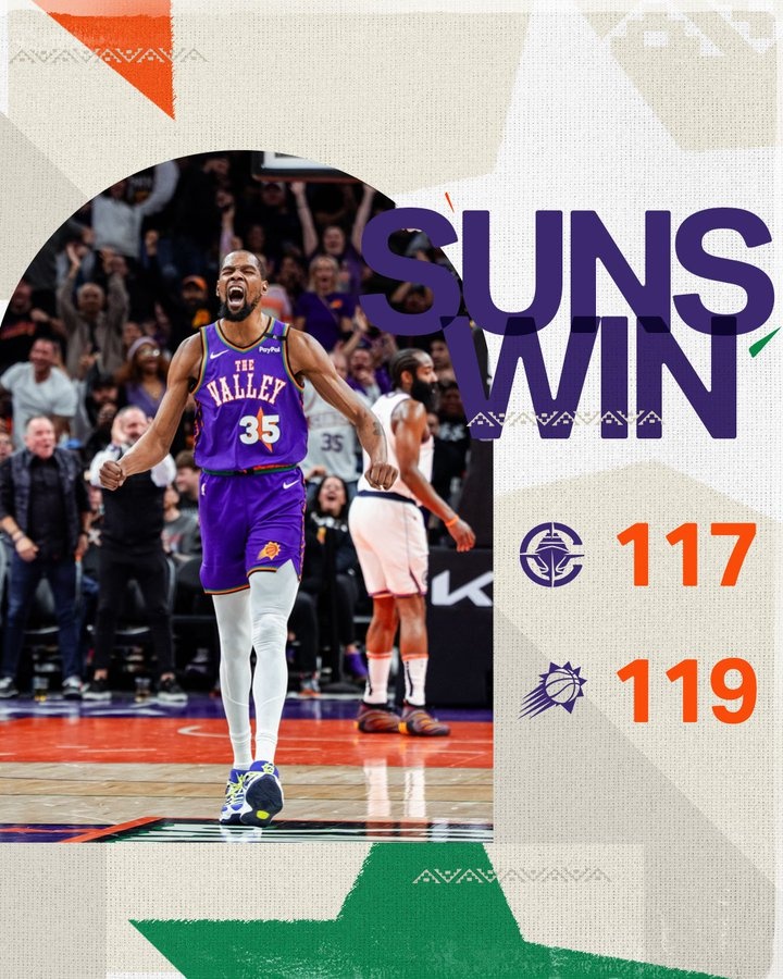 2025-03-05 22:22:09當記首功!太陽官方曬贏球海報 杜蘭特振臂怒吼 哈登成為背景