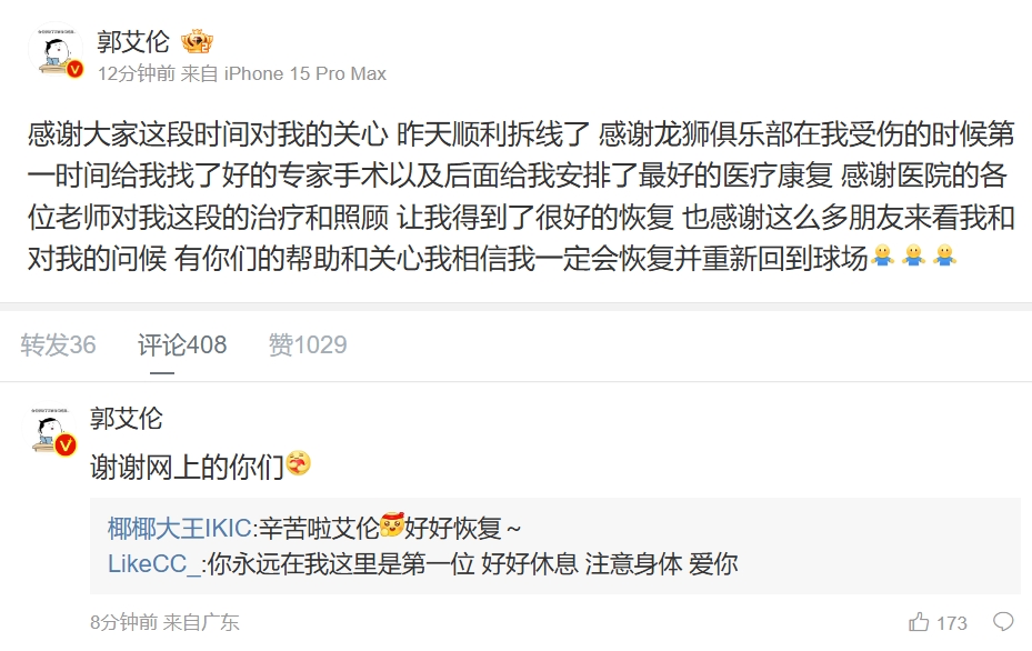 2025-03-05 22:24:10郭艾倫更博報平安:順利拆線了 我一定會恢復并回到球場!