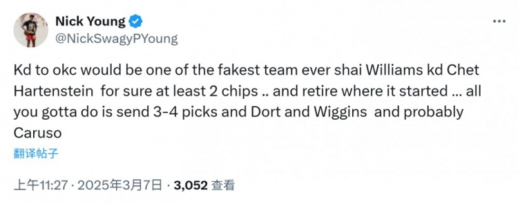 2025-03-07 14:11:38尼克-楊:杜蘭特若回雷霆至少能拿兩冠 還能在夢開始的地方退役