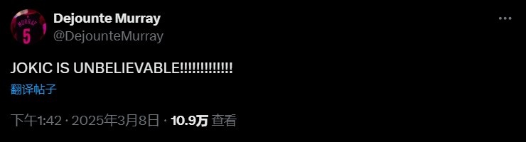 2025-03-08 20:56:16約吹+1!德章泰-穆雷更推:約基奇實在太不可思議了!