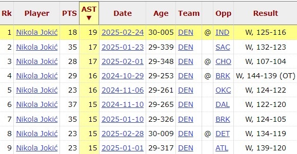 2025-03-08 21:17:47約基奇本賽季第10場比賽送出15+助攻 10戰全勝
