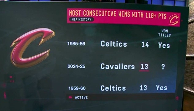 2025-03-08 21:24:49騎士成歷史第3支至少13連勝且得分皆110+球隊 此前綠軍2次都奪冠