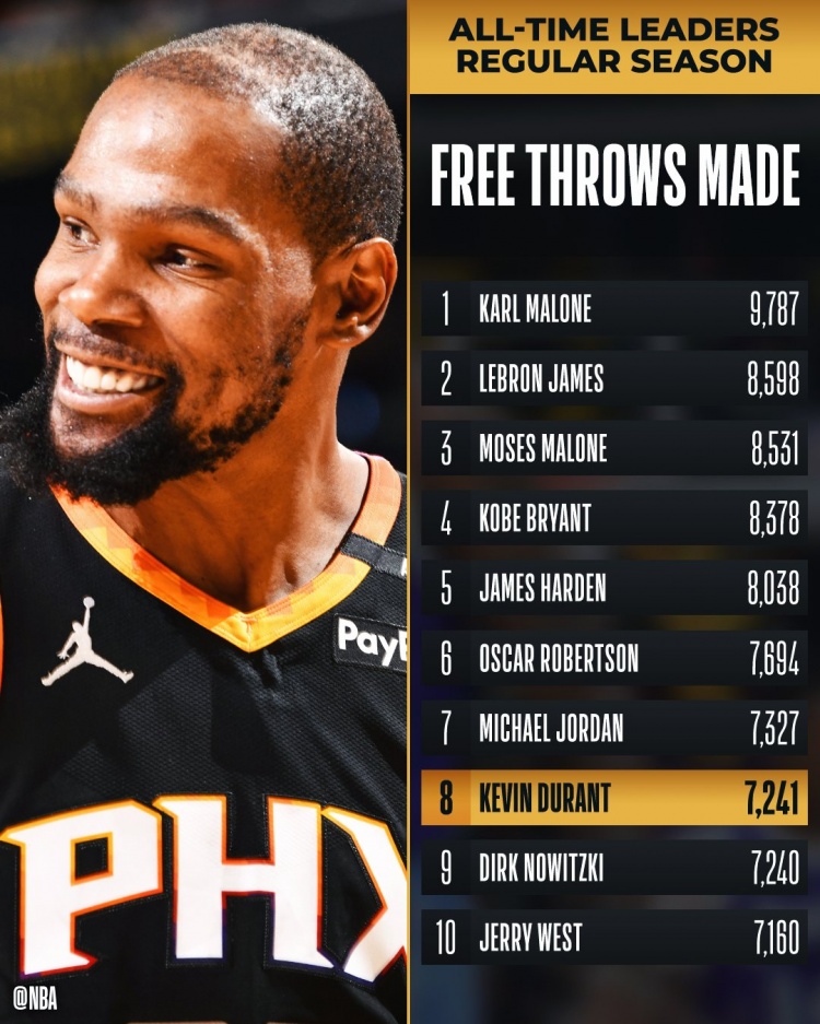 2025-03-10 10:02:56?KD常規(guī)賽罰球命中數(shù)達到7241次 超越諾維茨基升至歷史第8!