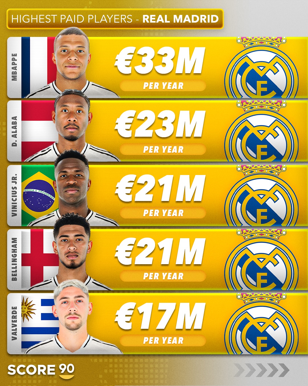 2025-03-11 23:05:33皇馬年薪前5:姆總3300萬第1 阿拉巴2300萬 維尼修斯&貝林2100萬