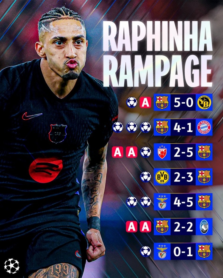 2025-03-11 23:14:16拉菲尼亞本賽季9場歐冠有7次參與進球,共計9球5助攻&戰拜仁戴帽