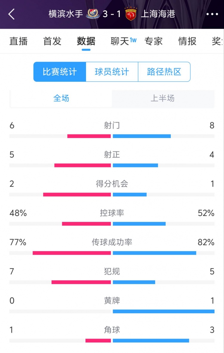 2025-03-11 23:19:27半場數據:海港射門8-6領先&射正4-5 控球率傳球成功率均高于橫濱