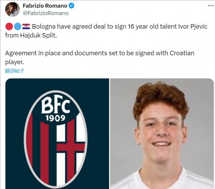 2025-03-11 23:25:03羅馬諾:博洛尼亞簽下克羅地亞16歲天才伊沃爾-普耶維奇