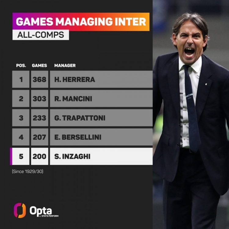 2025-03-12 07:38:34小因扎吉達成執教國米各項賽事200場里程碑,是隊史第5人