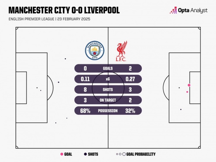 2025-02-24 16:05:53曼城0-2利物浦半場數據:控球率68%-32%,射門8-3,射正3-2