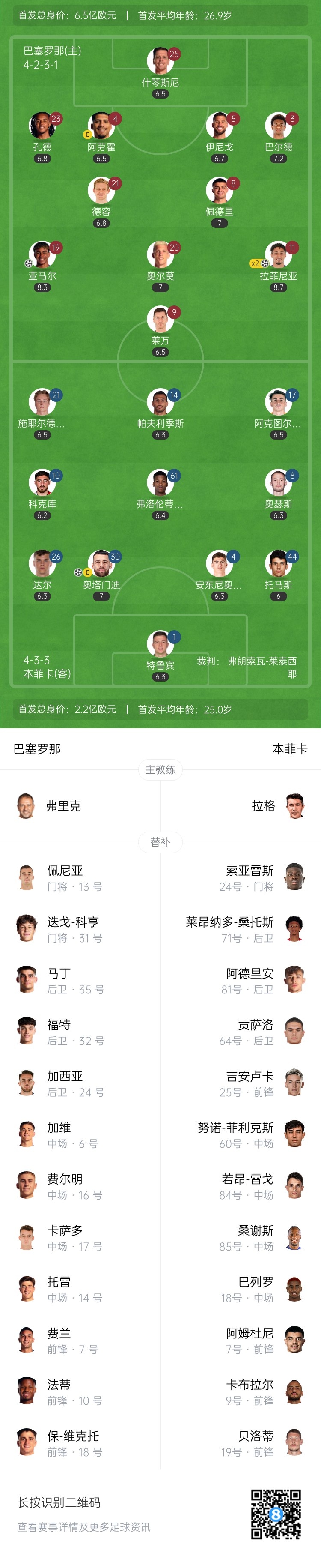 3月12日訊 北京時間1:45,歐冠1/8決賽次回合巴塞羅那主場迎戰本菲卡,首回合巴薩1-0占得先機。比賽在奧林匹克球場打響!上半場,亞馬爾助攻拉菲尼亞破門;奧塔門迪很快扳平;隨后亞馬爾左腳禁區外兜射破門!巴爾德反擊助攻拉菲尼亞完成雙響!半場結束,巴薩暫3-1領先本菲卡,總比分4-1!