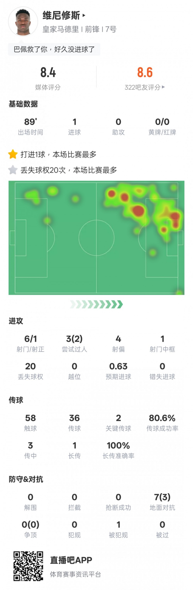 2025-02-24 16:05:59維尼修斯本場比賽數(shù)據(jù):1進(jìn)球&20次丟失球權(quán)全場最多,評(píng)分8.4