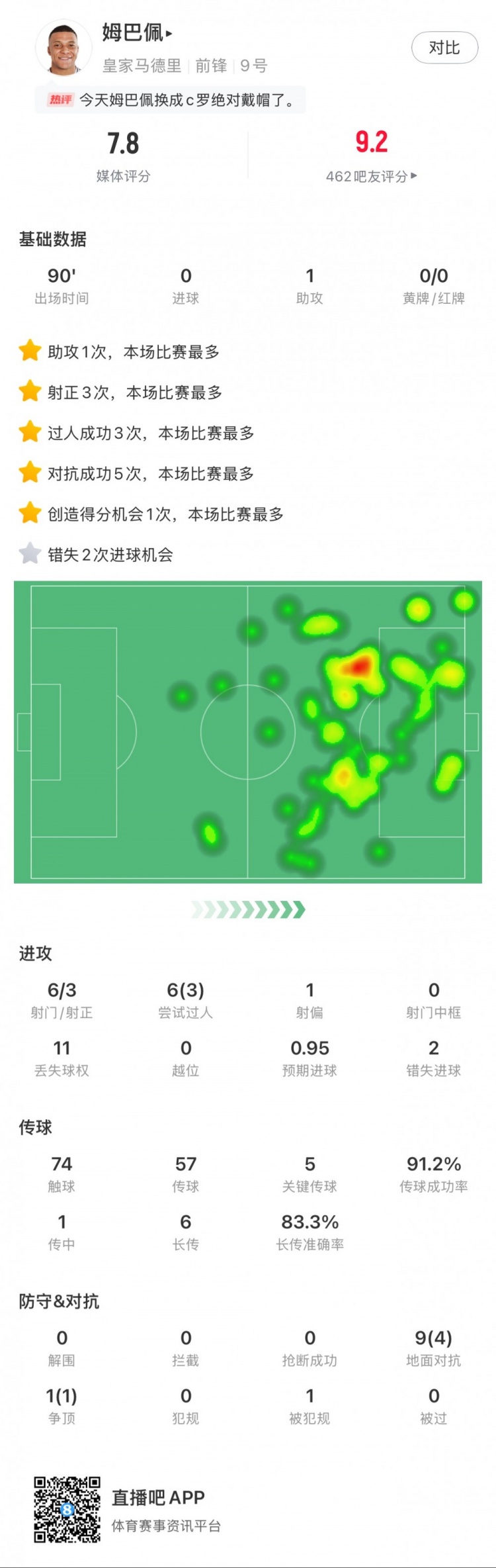 2025-02-24 16:06:01姆巴佩本場數據:1次助攻,6射3正,2次錯失得分機會,3次過人