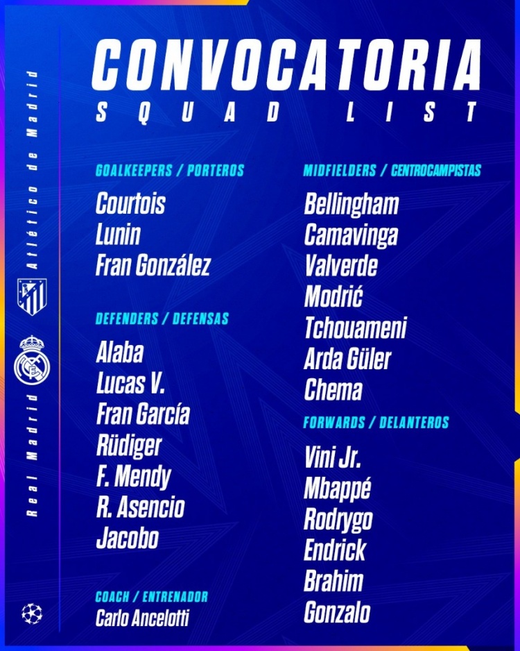 2025-03-12 20:53:26皇馬客戰馬競大名單:庫爾圖瓦&呂迪格回歸,姆巴佩領銜鋒線