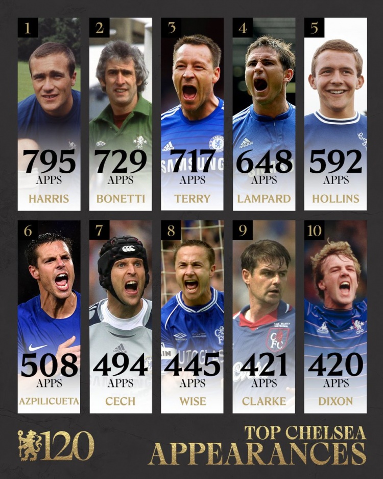 2025-03-12 20:55:16切爾西隊史出場榜:羅恩-哈里斯795場第一,特里第三,蘭帕德第四