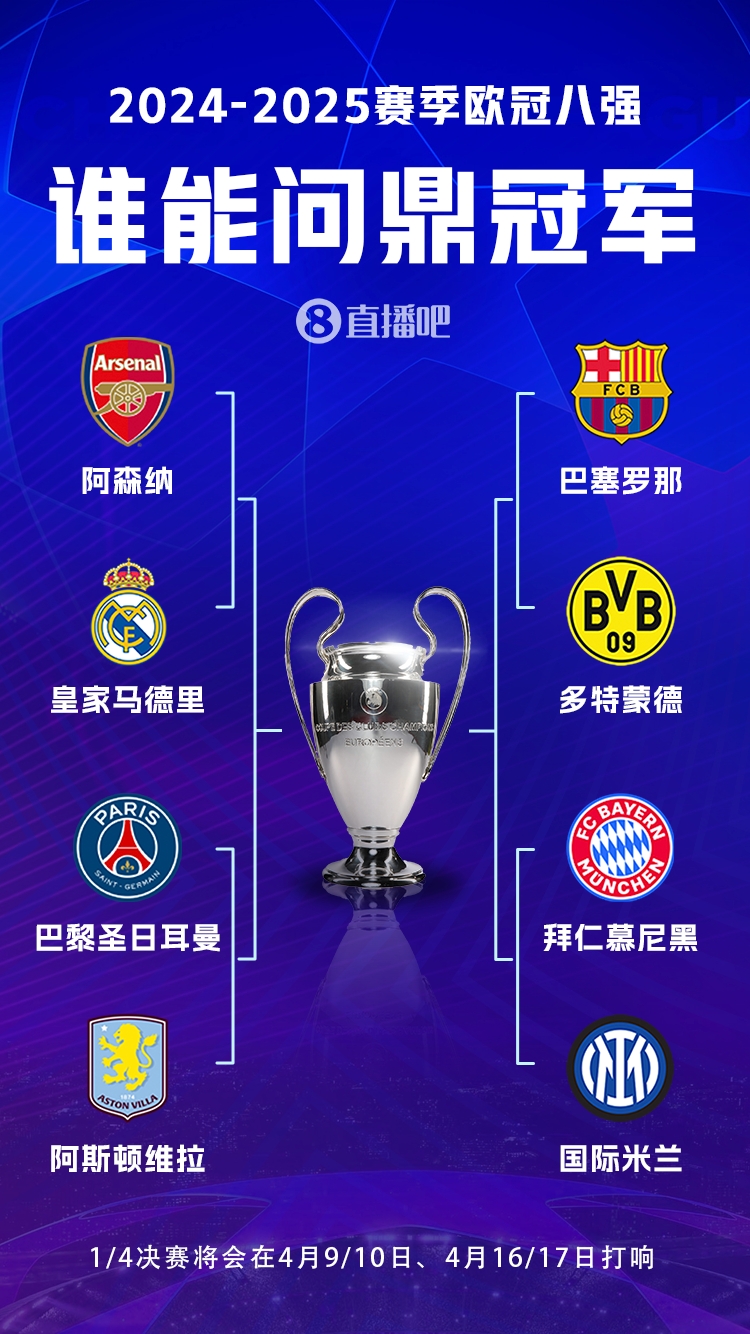 2025-03-13 12:30:16豪門之戰(zhàn)!歐冠8強(qiáng)全員五大聯(lián)賽,6隊拿過冠軍&槍手巴黎拿過亞軍